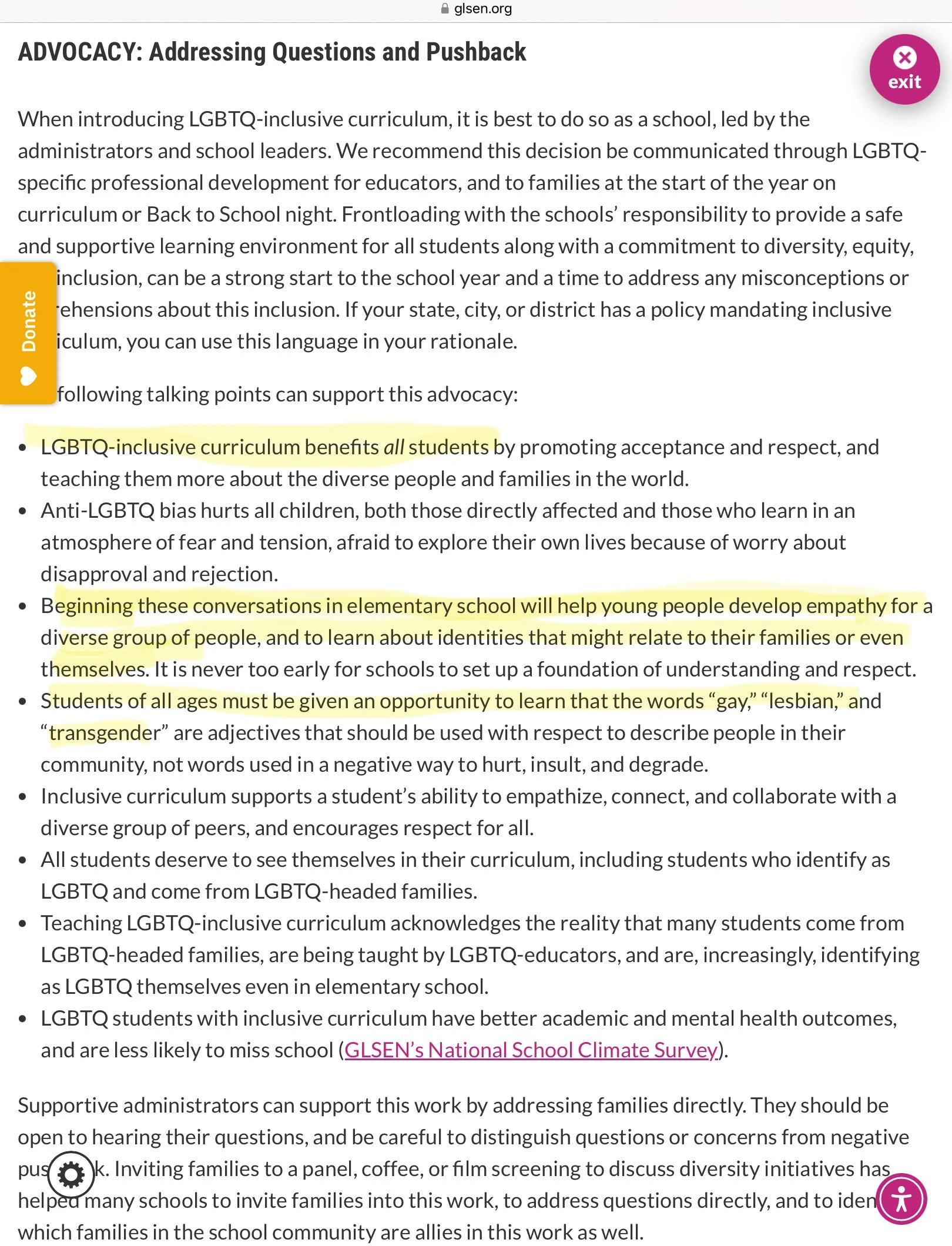 Per their website, GLSEN believes that LGBTQ-inclusive conversations should begin in elementary school and that science classes should incorporate LGBTQ-inclusive perspectives: "When teaching science it can quickly get very binary (sperm/egg, male/female, XX/XY).The most important thing is to dismantle this polarizing way of thinking and giving ample examples of ways that nature is not binary. Science class can be a place where a very complex world can be, incorrectly, summarized in binaries."